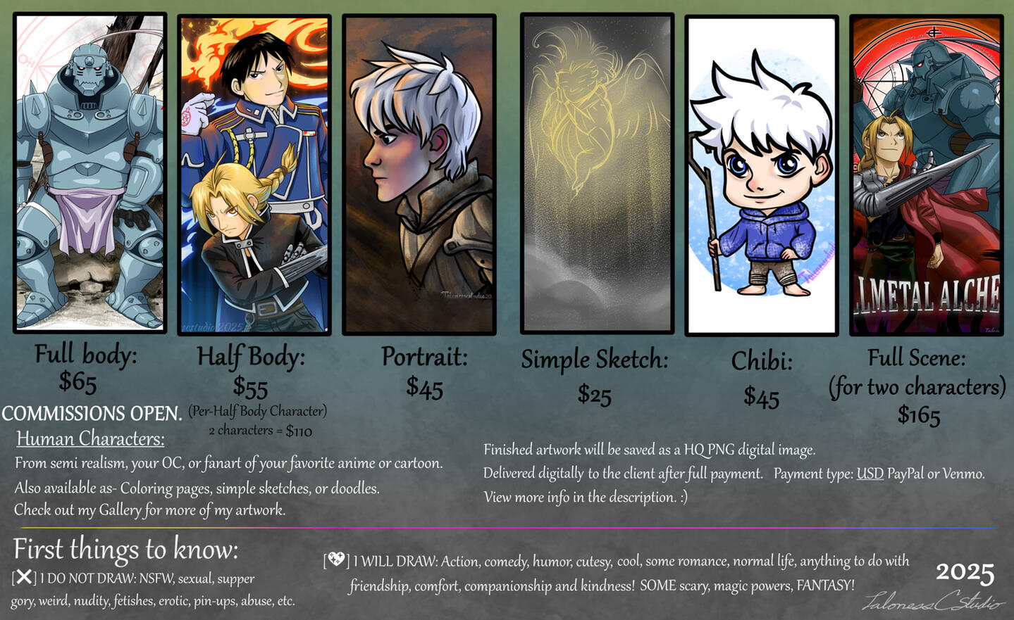 ______________________________________________________________________________________________________A fully drawn and colored digital illustration of a single character (full body, half body, or portrait.) The final price depends on your character's complexity and the background. $30-$500~see commission sheets for examplesUSD:Simple background: Add $10 - $20