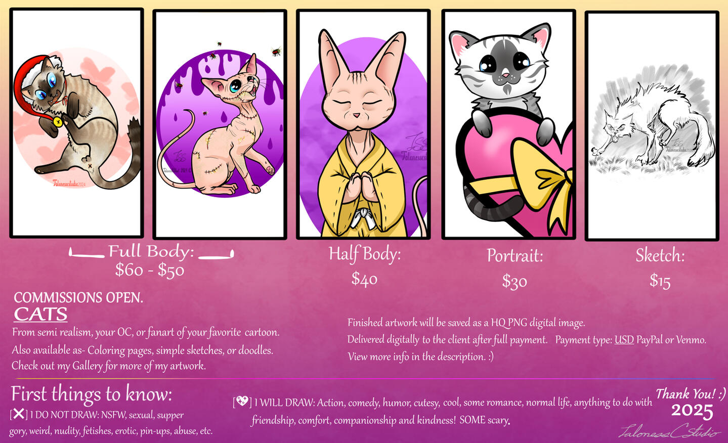 STARTING PRICES:HUMAN CHARACTERS: $25 - $65 Per character.CATS: $15 -$60 Per character.DRAGONS: $25 -$300 Per character.